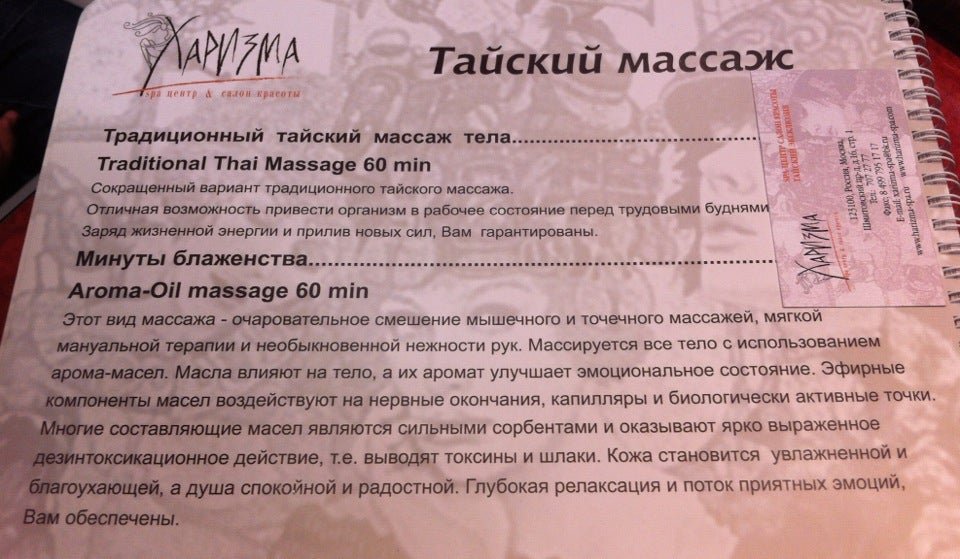 Еще одна услуга, которую оказывают в салоне Харизма - это тайский массаж. По воздействию на организм его часто сравнивают с йогой: он тоже добавляет позвоночнику и суставам гибкости и подвижности и глубоко расслабляет, вместе с тем укрепляя системы организма. Проводя общий тайский массаж, мастера воздействуют на определенные точки на теле, отвечающие за наше здоровье, в результате чего эффект от терапии чувствуется наиболее сильно.